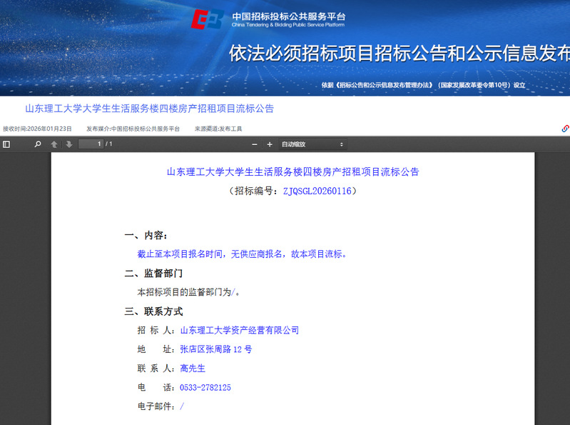 山东理工大学大学生生活服务楼四楼房产招租项目流标公告
